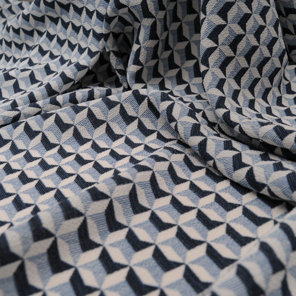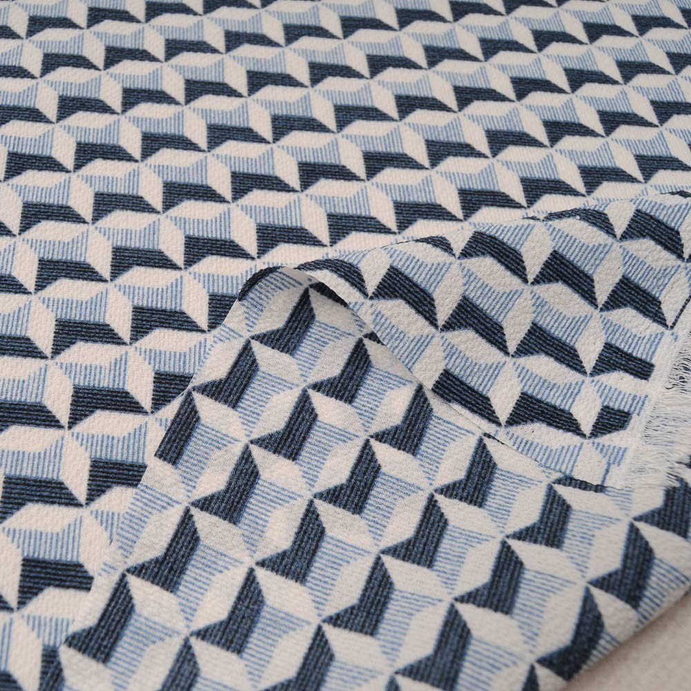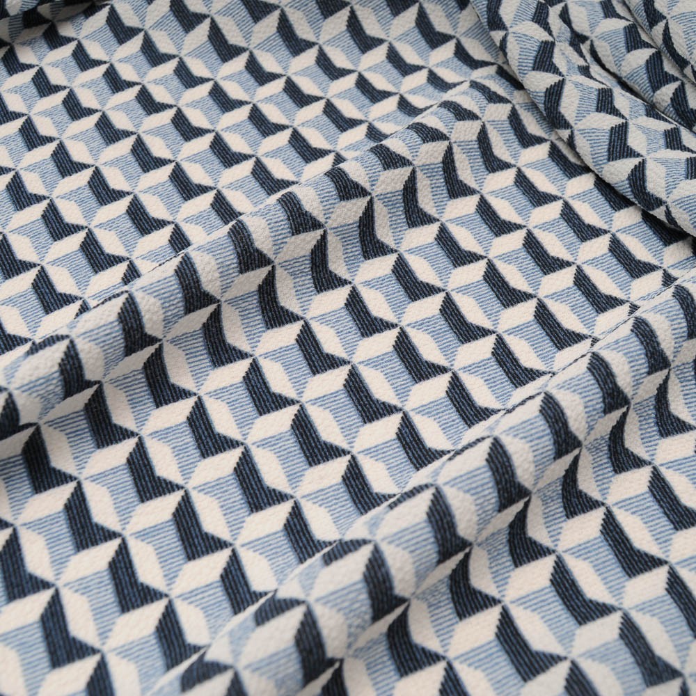 Joli imprimé pour ce crêpe bleu ciel, bleu marine et blanc